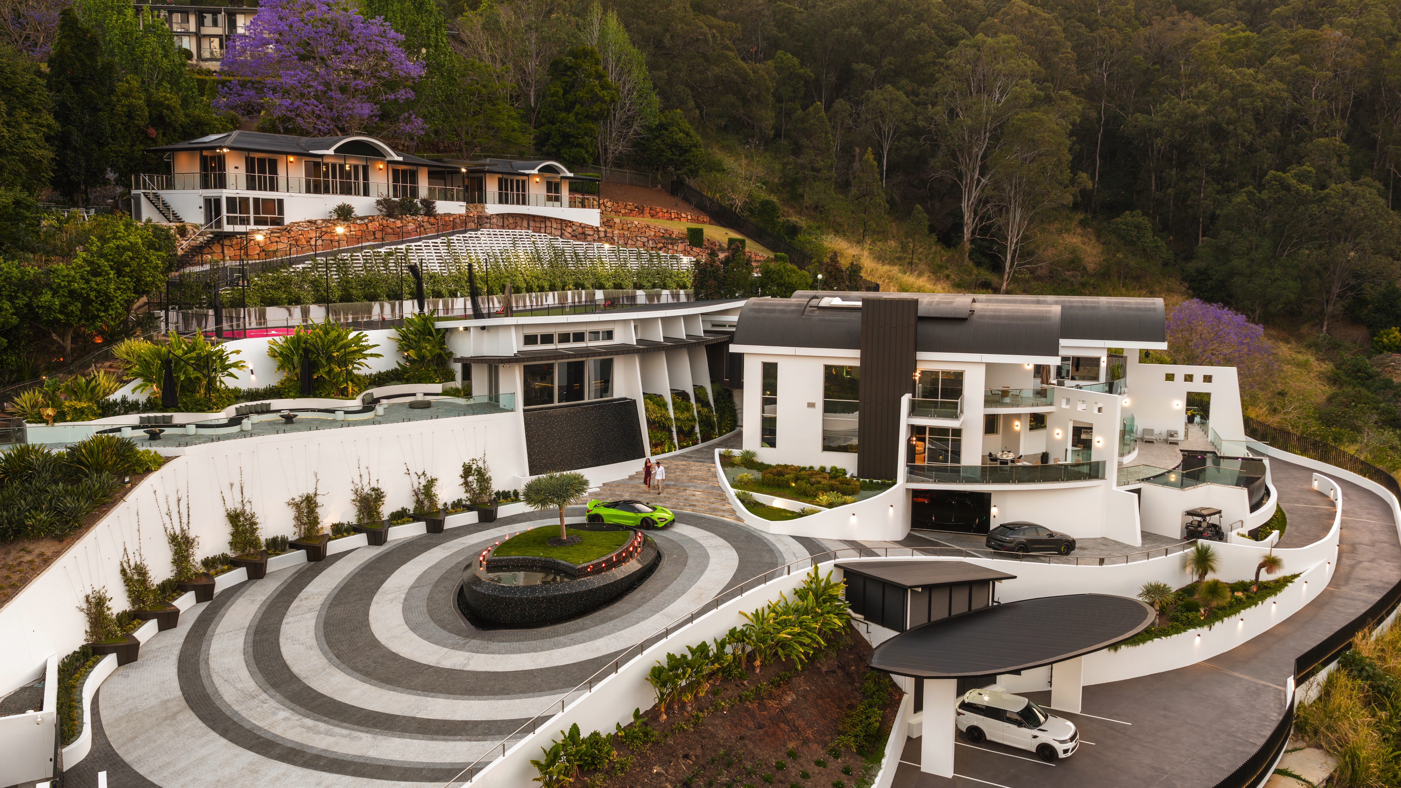 Arrival at The Estate is designed to impress from the first moment. As your vehicle approaches, advanced number plate recognition activates, opening the gates with a quiet efficiency that hints at the experience to come.More than just an entry, the driveway is a visual statement, crafted from 75,000 hand-laid cobblestones and illuminated with subtle guiding lights.The sound of cascading water from the central fountain draws you past living green walls and meticulously landscaped gardens, culminating at a soaring 30-foot glass facade that marks the beginning of something truly exceptional.